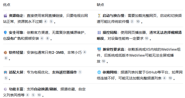 总的来说,WebView TV是一款思路新颖、以稳定见长的直播软件,非常适合追求频道稳定、不想频繁更换直播源、且设备性能不错的用户。